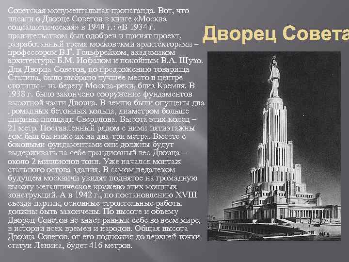Советская монументальная пропаганда. Вот, что писали о Дворце Советов в книге «Москва социалистическая» в 1940 г. : «В 1934 г. правительством был одобрен и принят проект, разработанный тремя московскми архитекторами – профессором В. Г. Гельфрейхом, академиком архитектуры Б. М. Иофаном и покойным В. А. Щуко. Для Дворца Советов, по предложению товарища Сталина, было выбрано лучшее место в центре столицы – на берегу Москва-реки, близ Кремля. В 1938 г. было закончено сооружение фундаментов высотной части Дворца. В землю были опущены два громадных бетонных кольца, диаметром больше ширины площади Свердлова. Высота этих колец – 21 метр. Поставленный рядом с ними пятиэтажны дом был бы ниже их на два-три метра. Вместе с боковыми фундаментами они должны будут выдерживать на себе грандиозный вес Дворца – около 2 миллионов тонн. Уже начался монтаж стального остова здания. В самом недалеком будущем москвичи увидят поднятое на громадную высоту металлическое кружево этих мощных конструкций. А в 1942 г. , по постановлению XVIII съезда партии, основные строительные работы должны быть закончены. По высоте и объему Дворец Советов не знает равных себе во всем мире, в истории всех времен и народов. Общая высота Дворца Советов, от его подножия до верхней точки статуи Ленина, будет 416 метров. Дворец Совета