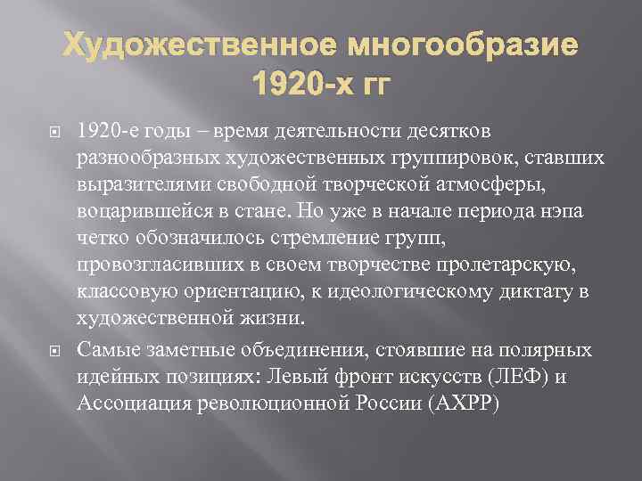 Художественное многообразие 1920 -х гг 1920 -е годы – время деятельности десятков разнообразных художественных группировок, ставших выразителями свободной творческой атмосферы, воцарившейся в стане. Но уже в начале периода нэпа четко обозначилось стремление групп, провозгласивших в своем творчестве пролетарскую, классовую ориентацию, к идеологическому диктату в художественной жизни. Самые заметные объединения, стоявшие на полярных идейных позициях: Левый фронт искусств (ЛЕФ) и Ассоциация революционной России (АХРР)