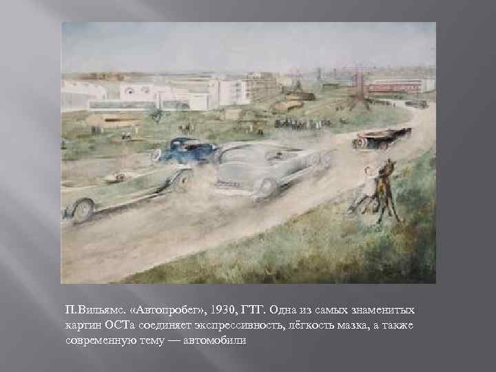 П. Вильямс. «Автопробег» , 1930, ГТГ. Одна из самых знаменитых картин ОСТа соединяет экспрессивность, лёгкость мазка, а также современную тему — автомобили
