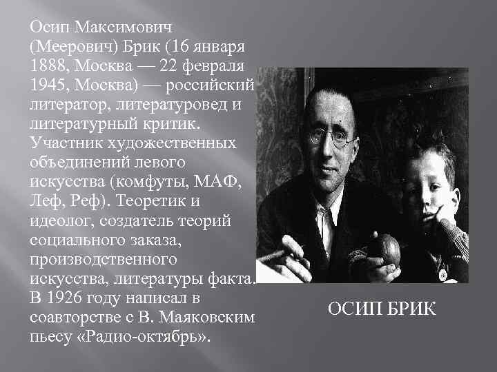 Осип Максимович (Меерович) Брик (16 января 1888, Москва — 22 февраля 1945, Москва) — российский литератор, литературовед и литературный критик. Участник художественных объединений левого искусства (комфуты, МАФ, Леф, Реф). Теоретик и идеолог, создатель теорий социального заказа, производственного искусства, литературы факта. В 1926 году написал в соавторстве с В. Маяковским пьесу «Радио-октябрь» . ОСИП БРИК