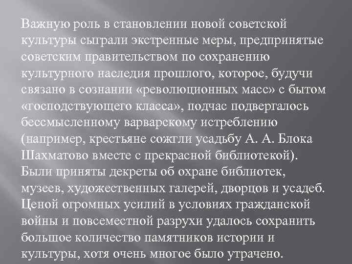 Важную роль в становлении новой советской культуры сыграли экстренные меры, предпринятые советским правительством по сохранению культурного наследия прошлого, которое, будучи связано в сознании «революционных масс» с бытом «господствующего класса» , подчас подвергалось бессмысленному варварскому истреблению (например, крестьяне сожгли усадьбу А. А. Блока Шахматово вместе с прекрасной библиотекой). Были приняты декреты об охране библиотек, музеев, художественных галерей, дворцов и усадеб. Ценой огромных усилий в условиях гражданской войны и повсеместной разрухи удалось сохранить большое количество памятников истории и культуры, хотя очень многое было утрачено.