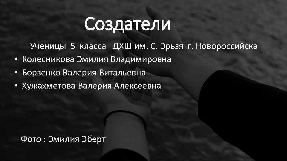 Создатели Ученицы 5 класса ДХШ им. С. Эрьзя г. Новороссийска • Колесникова Эмилия Владимировна • Борзенко Валерия Витальевна • Хужахметова Валерия Алексеевна Фото : Эмилия Эберт