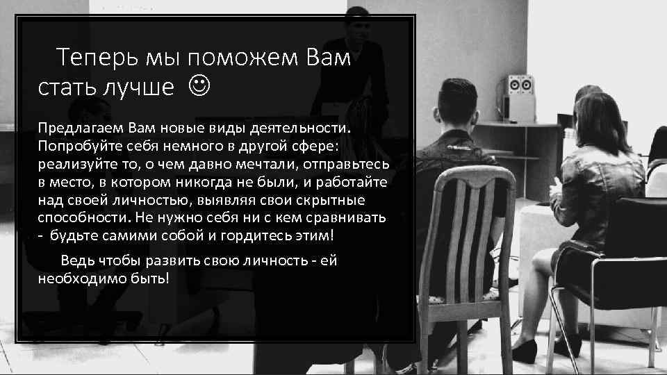 Теперь мы поможем Вам стать лучше Предлагаем Вам новые виды деятельности. Попробуйте себя немного в другой сфере: реализуйте то, о чем давно мечтали, отправьтесь в место, в котором никогда не были, и работайте над своей личностью, выявляя свои скрытные способности. Не нужно себя ни с кем сравнивать - будьте самими собой и гордитесь этим! Ведь чтобы развить свою личность - ей необходимо быть!