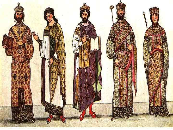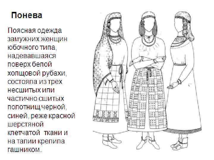 Древнерусская одежда Мужская одежда: Рубаха до колен и штаны (порты). Подолы, низ рукавов и ворот украшали вышивкой. Считалось, что орнамент со стилизованными изображением птиц, животных, солнца оберегает от нечистой силы. Шили рубахи из белой, синей и красной ткани с вставками других цветов. На спину и грудь подшивали подкладку – подоплеку. Епанча – плащ , который спереди пристегивали застежкой.