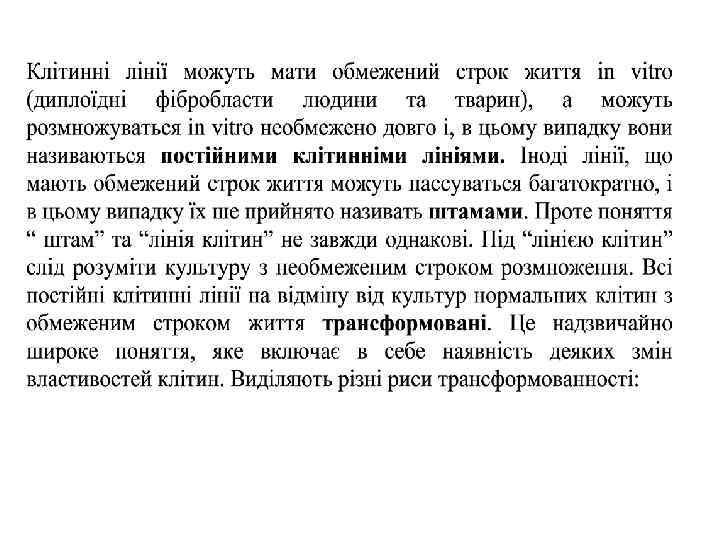 перша і основна риса – це набуття або ж повернення до так званого “безсмертя”; клітини вийшли із-під контролю організму, і, в якійсь мірі стали схожими на одноклітинні організми, хоча безсмертя характерне не для окремої клітини, а для популяції клітин. В процесі культивування, при багатократних пассажах властивості клітинної лінії можуть мінятись, і, тому для підтримання постійності характеристик клітинних ліній потрібно періодично їх заморожувати(паспорт клітинної культури) інші критерії трансформації такі як залежність від мікрооточення, факторів середовища та онкогенність проявляються у різних клітинних ліній в неодинаковій степені і, тому розрізняють мало- та сильно трансформовані лінії, онкогенні та неонкогенні.