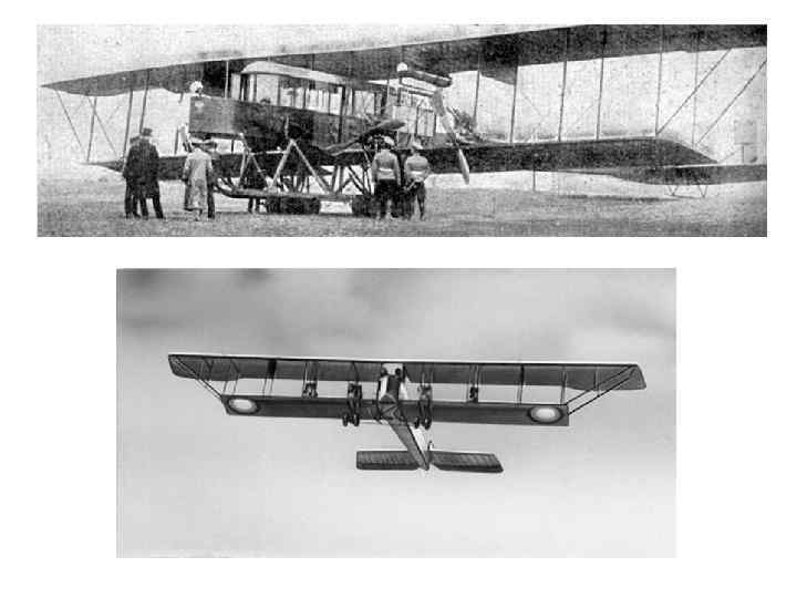 • Еще на заре развития авиации в России были созданы весьма совершенные по тому времени тяжелые самолеты. • Зимой 1912— 1913 гг. на Русско-Балтийском вагонном заводе в Петербурге под руководством Игоря Сикорского был построен и летом 1913 г. испытан первый в мире четырехмоторный самолет «Русский витязь» . Он был гораздо больше любого другого самолета тех лет. Размах верхнего крыла достигал 27 м, масса самолета 4, 2 т. Появление «Русского витязя» сыграло большую роль в развитии авиации. • В том же 1913 г. построен самолет «Илья Муромец» конструкции Сикорского. В отличие от «Русского витязя» он был не единственным опытным образцом: до 1918 г. было выпущено около 80 самолетов.