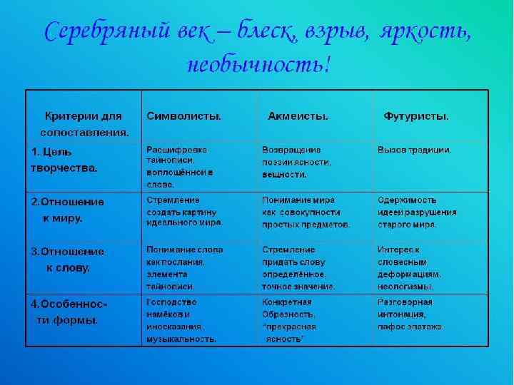 • Поиск новых путей развития русской культуры связан с усвоением прогрессивных веяний западной культуры. • Пестрота направлений и школ – черта русской культуры рубежа веков. • Западные веяния переплетаются и дополняются современными, наполняются конкретно русским содержанием. • Особенностью культуры этого периода является ее ориентация на философское осмысление жизни, необходимость выстроить целостную картину мира, где искусству наряду с наукой отводится огромная роль.