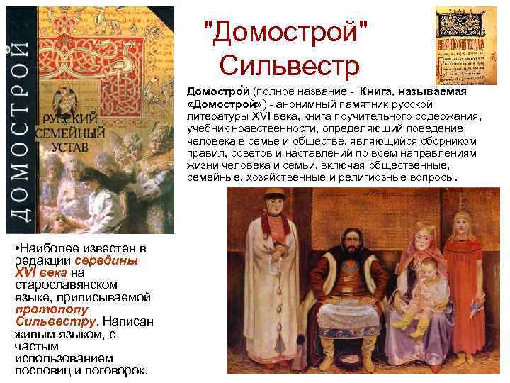 "Домострой" Сильвестр • • Наиболее известен в редакции середины XVI века на старославянском языке, приписываемой протопопу Сильвестру. Написан живым языком, с частым использованием пословиц и поговорок. Домостро й (полное название - Книга, называемая «Домострой» ) - анонимный памятник русской литературы XVI века, книга поучительного содержания, учебник нравственности, определяющий поведение человека в семье и обществе, являющийся сборником правил, советов и наставлений по всем направлениям жизни человека и семьи, включая общественные, семейные, хозяйственные и религиозные вопросы.