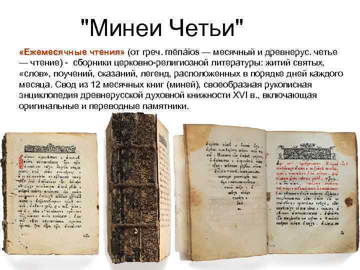 "Минеи Четьи" «Ежемесячные чтения» (от греч. mēnáios — месячный и древнерус. четье — чтение) - сборники церковно-религиозной литературы: житий святых, «слов» , поучений, сказаний, легенд, расположенных в порядке дней каждого месяца. Свод из 12 месячных книг (миней), своеобразная рукописная энциклопедия древнерусской духовной книжности XVI в. , включающая оригинальные и переводные памятники.