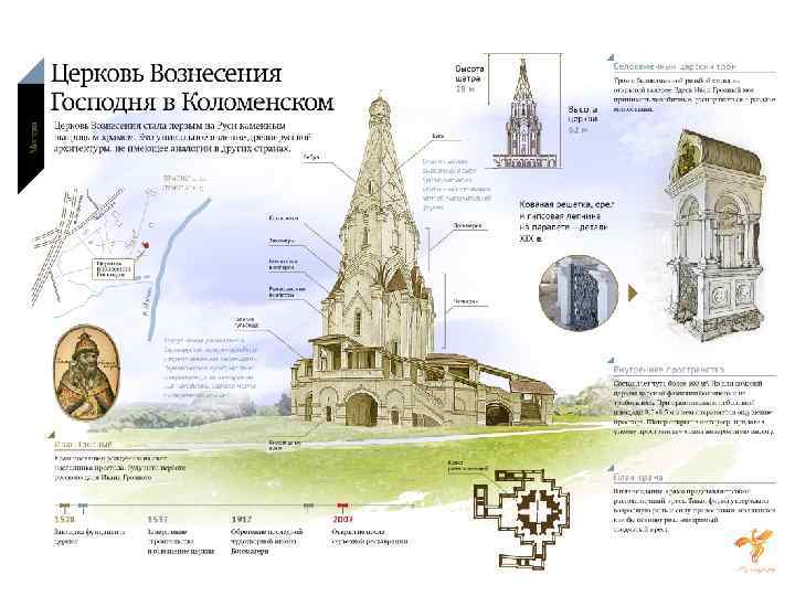 Архитектура XVI в. - век шатрового стиля смешение Владимиро-Суздальского стиля и элементов восточной культуры Впервые село Коломенское упоминается в 1339 году, в грамоте князя Ивана Калиты. С 14 века Коломенское стало загородной резиденцией великих московских князей, а затем и русских царей. Архитектурный ансамбль усадьбы Коломенское, сложившийся в 16 -17 веках, представляет большую художественную и историческую ценность. В комплекс Коломенского входят церковь Вознесения, церковь Усекновения главы Иоанна Предтечи в Дьяковском, храмколокольня Георгия Победоносца, церковь Казанской Богоматери, Водовзводная башня и двое каменных въездных ворот, построенных при царе Алексее Михайловиче. Церковь Вознесения, 1532 год