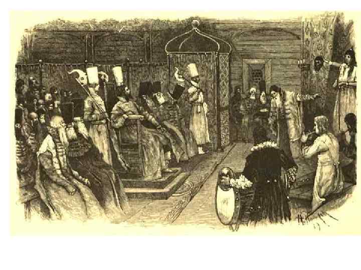 Быт и обычаи крестьян. А. Корзухин. Девичник. Семья состояла не более чем из 10 человек. В брак вступалиюноши с 15, а девушки с 12 лет. Браки могли заключаться до 3 раз. С 17 в. венчание в церкви стало обязательным. Одежда шилась из домотканного холста и шкур животных. Обувью служили лапти из лыка, или моршни из кожи.