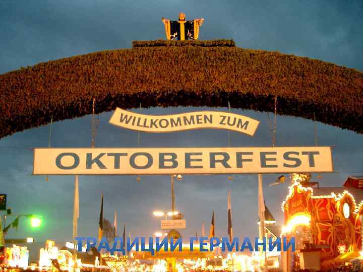 Октоберфест • Октоберфест — самое большое народное гуляние в мире. • Октоберфест привлекает каждый год около 6 млн Праздник проводится в середине сентября — начале октября на лугу Терезы — в центре Мюнхена. Его продолжительность в среднем составляет 16 дней. Праздник отличается большим количеством пивных палаток и разнообразных аттракционов. • Октоберфест организуется и проводится администрацией Мюнхена. К участию в этом фестивале допускаются только мюнхенские пивоваренные компании, которые варят для него специальное октоберфестовское пиво с содержанием алкоголя 5, 8— 6, 3 %, которое в другое время года обычно называют мартовским или венским. .