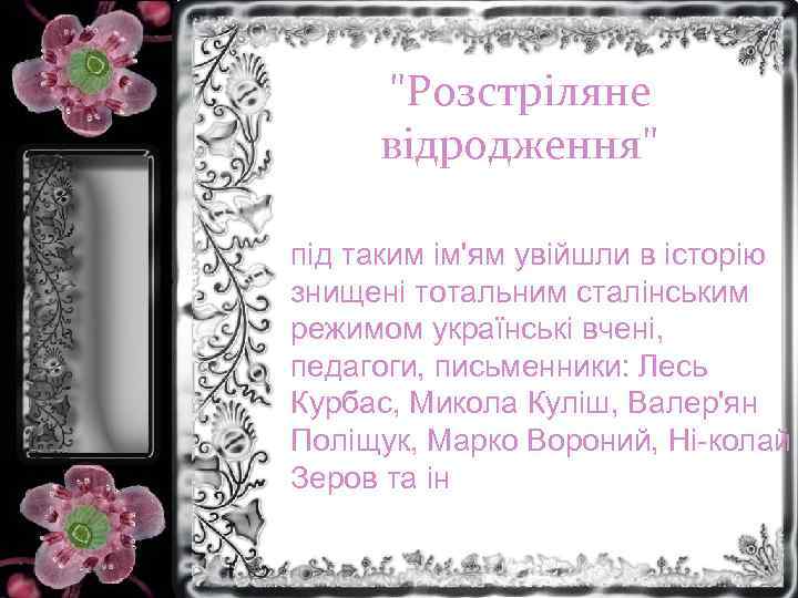 "Розстріляне відродження" під таким ім'ям увійшли в історію знищені тотальним сталінським режимом українські вчені, педагоги, письменники: Лесь Курбас, Микола Куліш, Валер'ян Поліщук, Марко Вороний, Ні-колай Зеров та ін