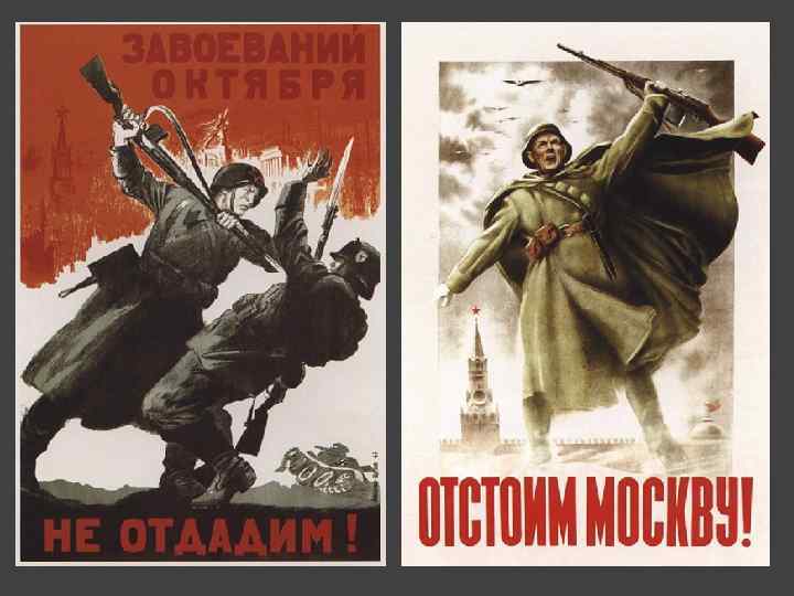 Агитационные плакаты Плакат был одним из самых важных жанров советского изобразительного искусства в годы Великой Отечественной войны. Плакаты были наглядным пособием для разъяснения отношения советской власти к событиям на фронте в доступной для большинства форме. Они воздействовали на сознание людей с целью побуждения к чему-либо. Выпускали плакаты в Москве, Ленинграде, Саратове, Томске, Челябинске и других городах.