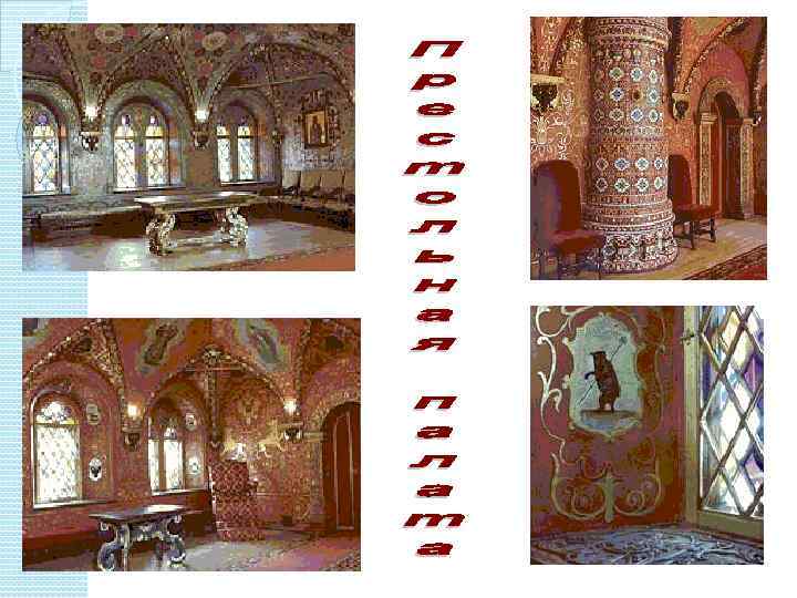 Теремной дворец в Московском Кремле В 1635 году царь Михаил Федорович начал сооружение дворца, получившего впоследствии название Теремного. Русские зодчие Антип Константинов, Бажен Огурцов, Трефил Шарутин и Ларион Ушаков, использовали части старого Кремлевского дворца, возведя над ними три этажа жилых хором. В 1636 году строительство Теремного дворца было закончено. Эти, как свидетельствовал летописец, "зело пречудные палаты" венчали золоченая кровля и стоящий на кровле Теремок. В большой комнате Теремка играли царевичи и заседали бояре. Для забавы русских престолонаследников в 1836 году к Теремку пристроили круглую смотровую башенку с разноцветными стеклами.
