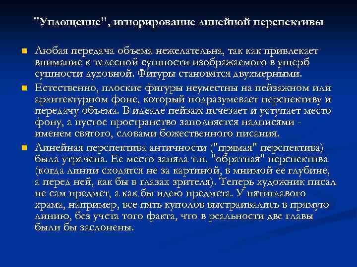 "Уплощение", игнорирование линейной перспективы n n n Любая передача объема нежелательна, так как привлекает внимание к телесной сущности изображаемого в ущерб сущности духовной. Фигуры становятся двухмерными. Естественно, плоские фигуры неуместны на пейзажном или архитектурном фоне, который подразумевает перспективу и передачу объема. В идеале пейзаж исчезает и уступает место фону, а пустое пространство заполняется надписями именем святого, словами божественного писания. Линейная перспектива античности ("прямая" перспектива) была утрачена. Ее место заняла т. н. "обратная" перспектива (когда линии сходятся не за картиной, в мнимой ее глубине, а перед ней, как бы в глазах зрителя). Теперь художник писал не сам предмет, а как бы идею предмета. У пятиглавого храма, например, все пять куполов выстраивались в прямую линию, без учета того факта, что в реальности две главы были бы заслонены.