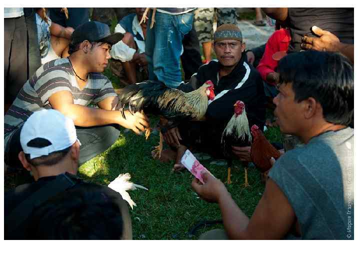 Правила 1. Фактически никто не заключает пари против петуха, который принадлежит члену его родственной группы. 2. Если ваша родственная группа в поединке не участвует, вы аналогичным образом будете поддерживать связанную с вами какими-то узами родственную группу против не связанной с вами родственной группы 3. Если петух со стороны бьется с каким-нибудь петухом из вашей деревни, то следует поддерживать местного петуха 4. Петухи, привезенные откуда-нибудь издалека, почти всегда оказываются в фаворитах Почему?