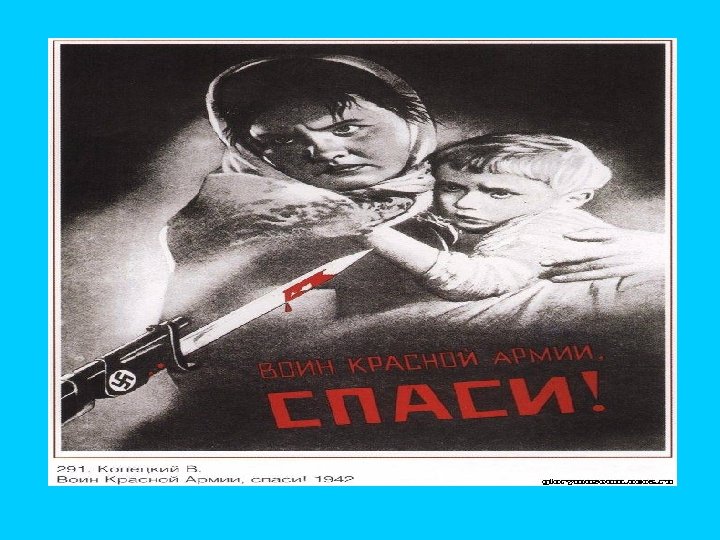 n Плакат В. Корецкого “Воин Красной Армии, спаси!”, впервые напечатанный в газете “Правда” 5 августа 1942 года, вызывал у бойцов ненависть к врагу. Драматическая сила этого плаката поражает и по сей день. Древний мотив – мать с ребенком на руках – получает в плакате совсем другую интерпретацию, нежели мы привыкли видеть в картинах мастеров прошлого. В данной работе нет идиллических черт, сердечности и теплоты, которые обычно присутствуют в сценах с матерью и ребенком, здесь мать изображается защищающей своего ребенка от опасности.