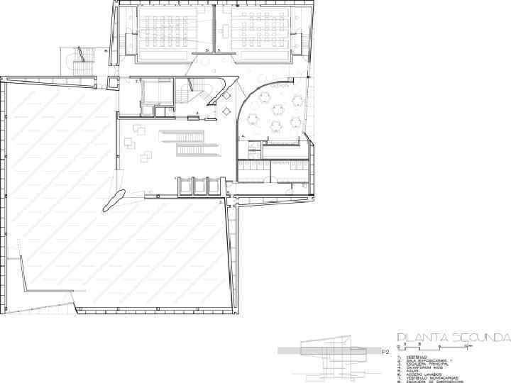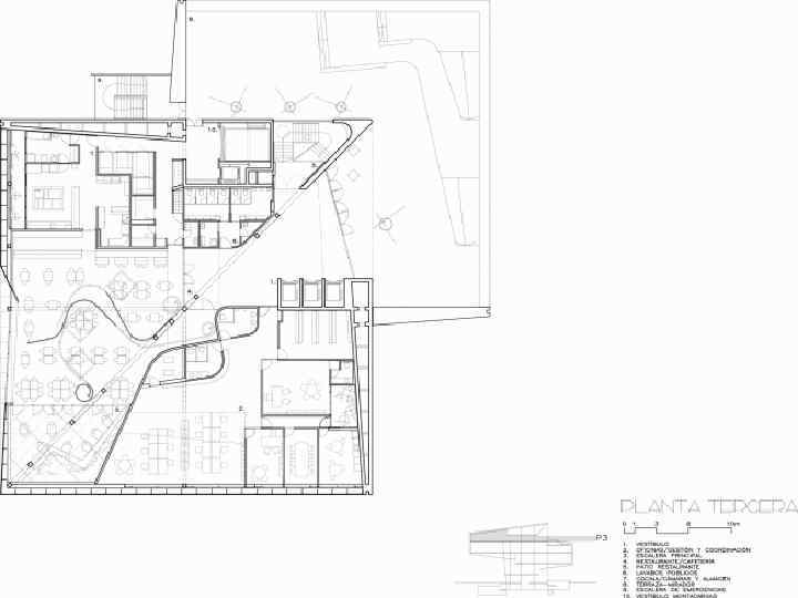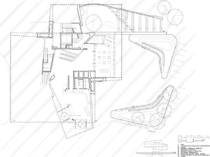 Консольно нависающие над парком объемы разнесены по вертикали, чтобы не перекрывать другу вид на город. Эти две части здания, в которых находятся многофункциональные залы вместимостью 250 человек и выставочные пространства, соединяются между собой эскалаторами. Из ресторана, расположенного на самом верху, открывается панорама городского центра, в то время как внешние террасы обращены на сторону выставочного комплекса ЭКСПО-2008: на мостпавильон Захи Хадид и «Водяную башню» Энрике де Тереса.