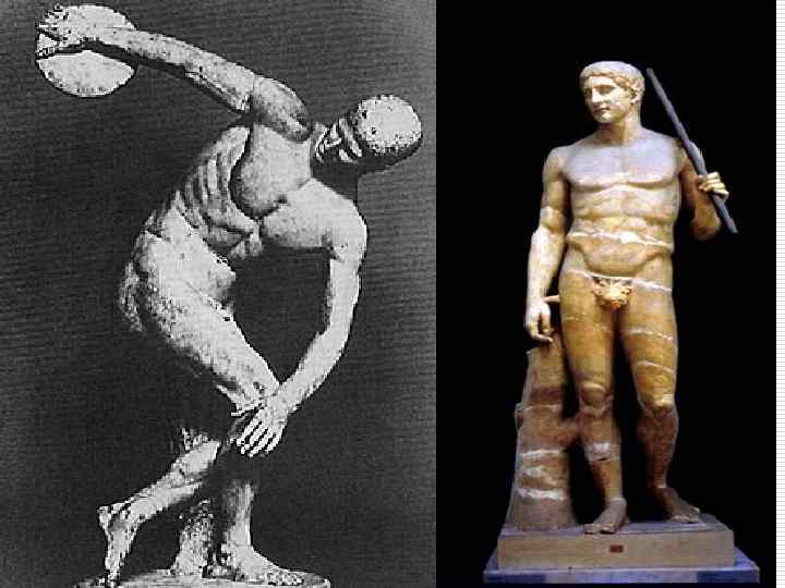 5. Искусство Античности. o o Понятие «античное искусство» . Античное искусство – это искусство Древней Греции, а также стран и народов, которые развивались под её определяющим влиянием (эллинистические государства Азии, Африки, Древний Рим). o Характерные особенности античного искусства: Общность тем, мотивов, форм, а главное ‑ эстетического идеала, окончательно сложившегося в классическую эпоху (5 в. д. н. э. ). Социальный фон формирования эстетического идеала: полисная демократия (развитые институты самоуправления в сочетании с высоким уровнем социальных и политических прав, гарантированных всем гражданам государства). n o o Классический идеал свободной, самодостаточной личности отражен в скульптуре. Античная скульптура создала образ прекрасного, доблестного, сознающего свое совершенство человека, красота которого носит уравновешенный и спокойный характер. (Архаические куросы и коры, Поликлет «Дорифор» , Мирон «Дискобол» ).