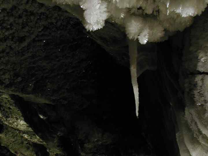 Кристаллы растут всю зиму и достигают необычайно крупных размеров, одевая пещеру в морозный ледяной наряд, равного которому нет ни в одной из знаменитых пещер мира, а живая елка в пещере стоит круглый год.
