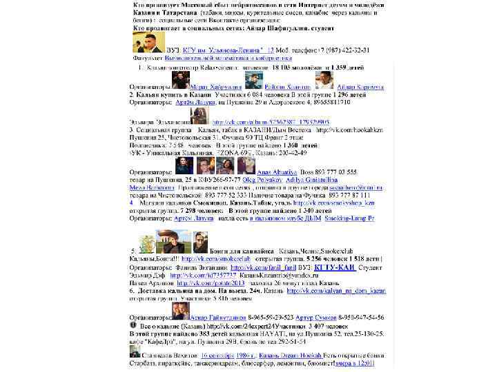 Масштабы распространения: Вконтакте охвачены все дети и молодёжь • • • Социальная группа Кальян-кинотеатр Relax • cinema: 247 -54 -47 Казань Участники 18 103 В этой группе найдено 1 835 детей| Социальная группа Кальян купить в Казани Это открытая группа. Участники 6 084 В этой группе найдено 1 296 детей Социальная группа Кальян, табак в КАЗАНИ/Дым Востока В этой группе найдено 1 360 детей Социальная группа Магазин кальянов Смокишоп. Казань. Табак, уголь В этой группе найдено 1 340 детей Социальная группа Казань, Челны, Smokerclub Кальяны, Бонги!!! Для каннабиса Участники 5 256 : В этой группе найдено 1 518 дети Социальная группа Все о кальяне (Казань) http: //vk. com/24 expert 24 Участники 3 407 молодёжь В этой группе найдено 1 110 детей