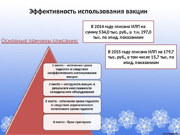 Эффективность использования вакцин В 2015 году списано ИЛП на 179, 7 тыс. руб. , в том числе 15, 7 тыс. по эпид. показаниям. Основные причины списания: В 2014 году списано ИЛП на сумму 534, 0 тыс. руб. , в т. ч. 297, 0 тыс. по эпид. показаниям