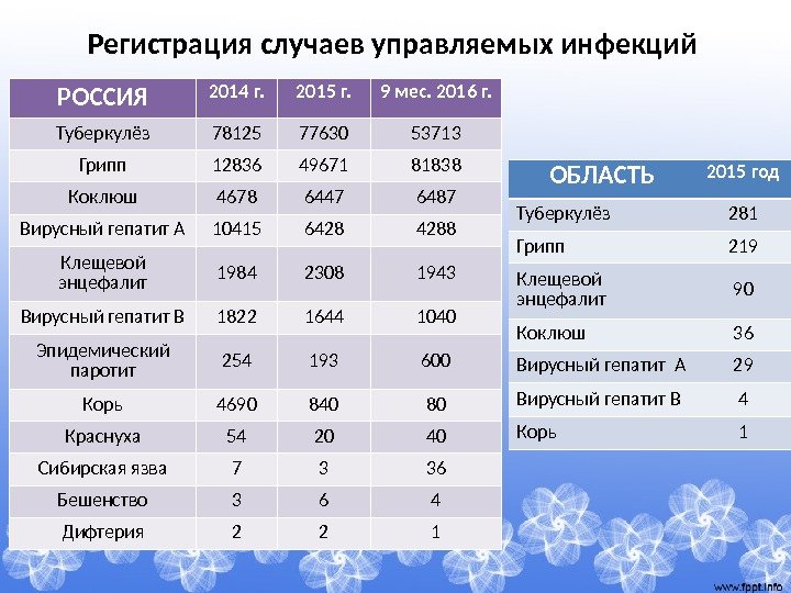 Регистрация случаев управляемых инфекций РОССИЯ 2014 г. 2015 г. 9 мес. 2016 г. Туберкулёз 78125 77630 53713 Грипп 12836 49671 81838 Коклюш 4678 6447 6487 Вирусный гепатит А 10415 6428 4288 Клещевой энцефалит 1984 2308 1943 Вирусный гепатит В 1822 1644 1040 Эпидемический паротит 254 193 600 Корь 4690 840 80 Краснуха 54 20 40 Сибирская язва 7 3 36 Бешенство 3 6 4 Дифтерия 2 2 1 ОБЛАСТЬ 2015 год Туберкулёз 281 Грипп 219 Клещевой энцефалит 90 Коклюш 36 Вирусный гепатит А 29 Вирусный гепатит В 4 Корь