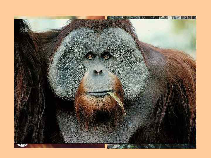 • Орангутан — малайское слово, оно означает «человек лесной» . Это крупные обезьяны. Масса тела самцов орангутанов с Калимантана 189 кг, самки имеют массу лишь 81 кг. Отдельные особи самцов в зоопарках могут достигать 200 -250 кг. Длина тела 130 -140 см у самцов, 110 -120 см у самок. Шерсть орангутанов очень длинная, особенно на плечах и в верхних отделах рук (до 40 см). Цвет ее красновато-рыжеватый, с возрастом она немного темнеет, Орангутаны держатся небольшими группами. Состав таких групп очень разнообразен: самец и самка с детенышами или без них, самка с детенышем и подростком, 2— 3 почти взрослые особи. Иногда попадаются одиночные самцы. Орангутаны довольно молчаливые животные и издают мало звуков.