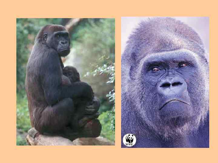 • Гориллы — самые крупные из человекообразных обезьян. Длина тела самцов достигает 180 см, масса тела 250 кг и более. В зоопарках самцы могут иметь и большую массу. Самки вдвое легче и меньше самцов. Сложение тела массивное, сильно развита мускулатура. Туловище горилл массивное, с большим животом; плечи широкие; голова крупная, у взрослых самцов коническая. Шерсть короткая, густая, черного цвета, у взрослых самцов на спине бывает серебристая полоса, есть небольшая бородка. Объем мозга составляет в среднем около 500 -600 куб. см, иногда — до 752 куб. см. Гориллы обитают в густых лесах Экваториальной Африки. Береговая горилла встречается в Камеруне, Экваториальной Гвинее, Габоне, Конго, Центрально-Африканской Республике.