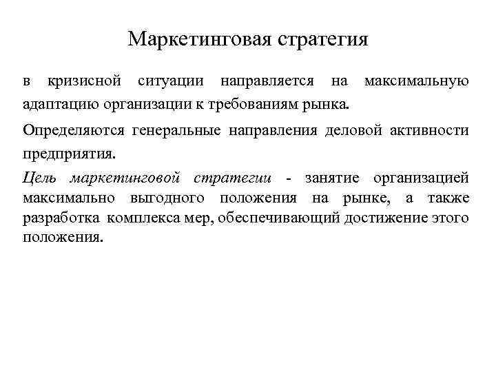 Маркетинговая стратегия в кризисной ситуации направляется на максимальную адаптацию организации к требованиям рынка. Определяются генеральные направления деловой активности предприятия. Цель маркетинговой стратегии занятие организацией максимально выгодного положения на рынке, а также разработка комплекса мер, обеспечивающий достижение этого положения.