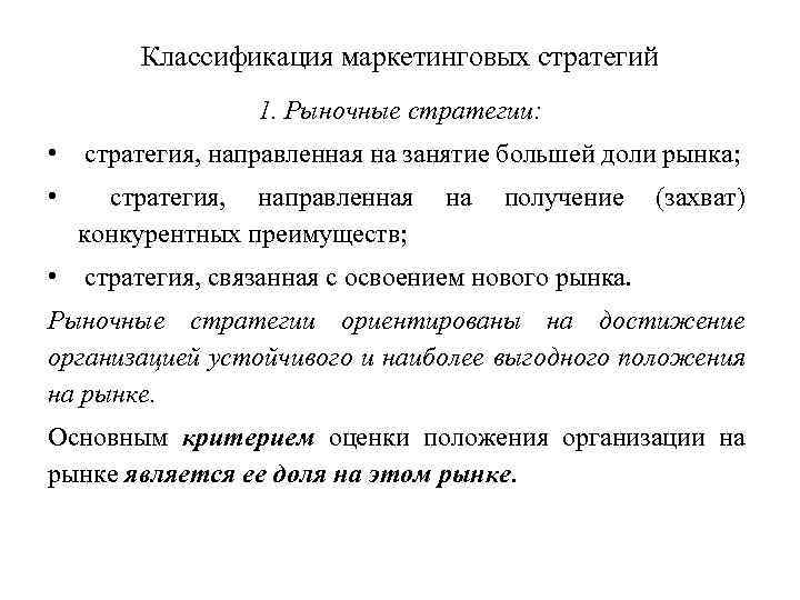 Классификация маркетинговых стратегий 1. Рыночные стратегии: • стратегия, направленная на занятие большей доли рынка; • стратегия, направленная на получение (захват) конкурентных преимуществ; • стратегия, связанная с освоением нового рынка. Рыночные стратегии ориентированы на достижение организацией устойчивого и наиболее выгодного положения на рынке. Основным критерием оценки положения организации на рынке является ее доля на этом рынке.
