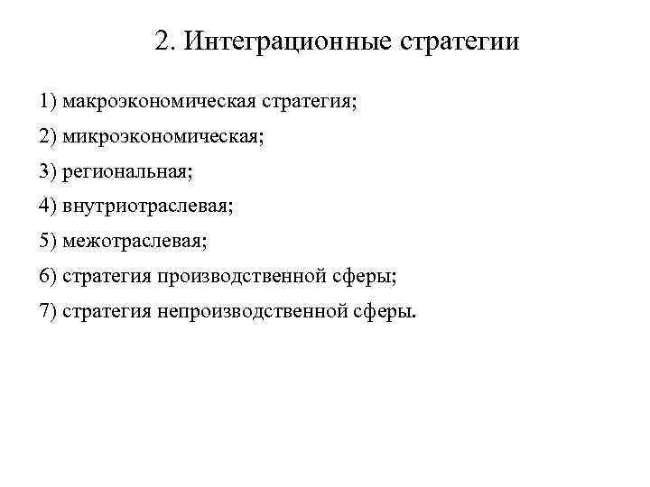 2. Интеграционные стратегии 1) макроэкономическая стратегия; 2) микроэкономическая; 3) региональная; 4) внутриотраслевая; 5) межотраслевая; 6) стратегия производственной сферы; 7) стратегия непроизводственной сферы.