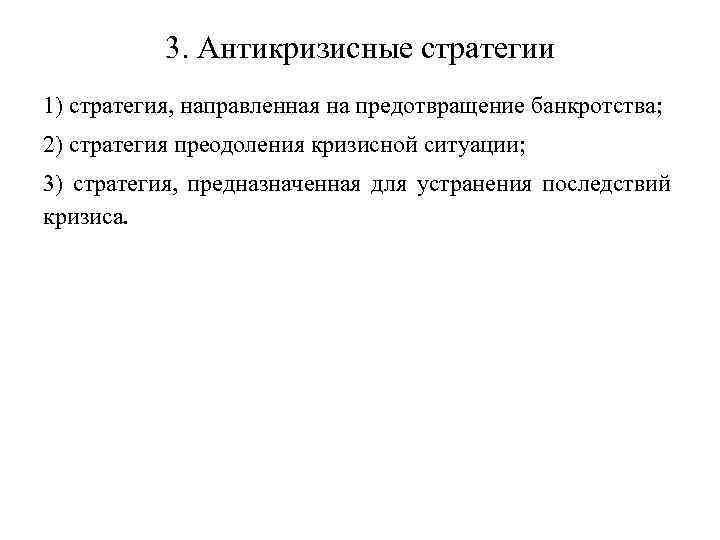 3. Антикризисные стратегии 1) стратегия, направленная на предотвращение банкротства; 2) стратегия преодоления кризисной ситуации; 3) стратегия, предназначенная для устранения последствий кризиса.