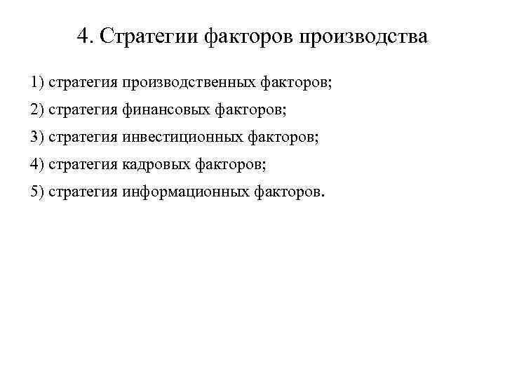 4. Стратегии факторов производства 1) стратегия производственных факторов; 2) стратегия финансовых факторов; 3) стратегия инвестиционных факторов; 4) стратегия кадровых факторов; 5) стратегия информационных факторов.