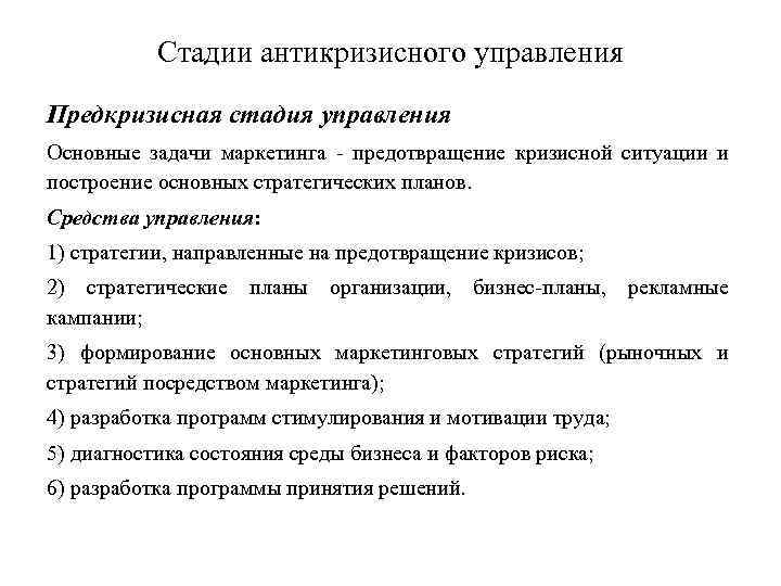 Стадии антикризисного управления Предкризисная стадия управления Основные задачи маркетинга предотвращение кризисной ситуации и построение основных стратегических планов. Средства управления: 1) стратегии, направленные на предотвращение кризисов; 2) стратегические планы организации, бизнес планы, рекламные кампании; 3) формирование основных маркетинговых стратегий (рыночных и стратегий посредством маркетинга); 4) разработка программ стимулирования и мотивации труда; 5) диагностика состояния среды бизнеса и факторов риска; 6) разработка программы принятия решений.