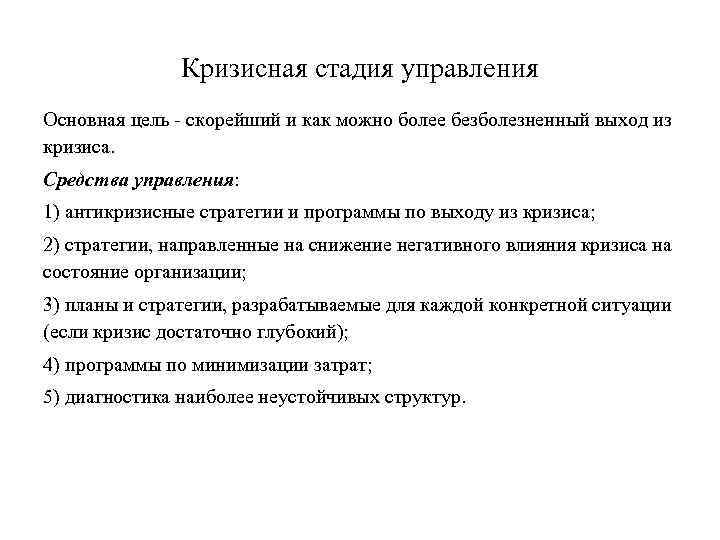 Кризисная стадия управления Основная цель скорейший и как можно более безболезненный выход из кризиса. Средства управления: 1) антикризисные стратегии и программы по выходу из кризиса; 2) стратегии, направленные на снижение негативного влияния кризиса на состояние организации; 3) планы и стратегии, разрабатываемые для каждой конкретной ситуации (если кризис достаточно глубокий); 4) программы по минимизации затрат; 5) диагностика наиболее неустойчивых структур.