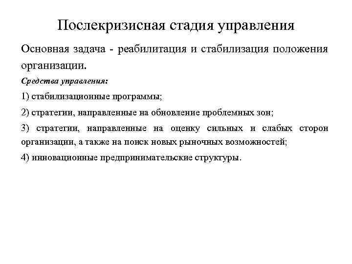 Послекризисная стадия управления Основная задача реабилитация и стабилизация положения организации. Средства управления: 1) стабилизационные программы; 2) стратегии, направленные на обновление проблемных зон; 3) стратегии, направленные на оценку сильных и слабых сторон организации, а также на поиск новых рыночных возможностей; 4) инновационные предпринимательские структуры.