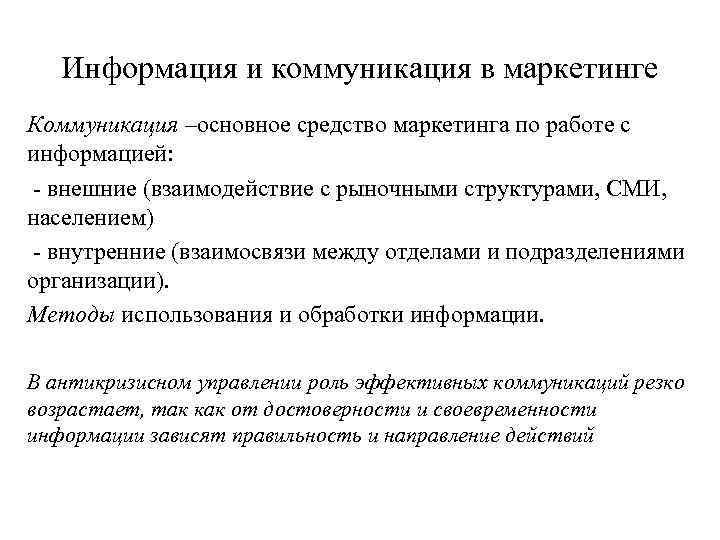Информация и коммуникация в маркетинге Коммуникация –основное средство маркетинга по работе с информацией: внешние (взаимодействие с рыночными структурами, СМИ, населением) внутренние (взаимосвязи между отделами и подразделениями организации). Методы использования и обработки информации. В антикризисном управлении роль эффективных коммуникаций резко возрастает, так как от достоверности и своевременности информации зависят правильность и направление действий