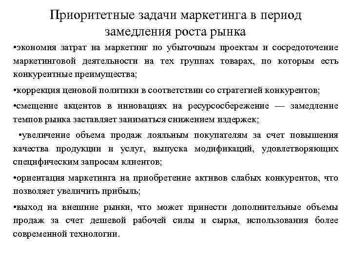 Приоритетные задачи маркетинга в период замедления роста рынка • экономия затрат на маркетинг по убыточным проектам и сосредоточение маркетинговой деятельности на тех группах товарах, по которым есть конкурентные преимущества; • коррекция ценовой политики в соответствии со стратегией конкурентов; • смещение акцентов в инновациях на ресурсосбережение — замедление темпов рынка заставляет заниматься снижением издержек; • увеличение объема продаж лояльным покупателям за счет повышения качества продукции и услуг, выпуска модификаций, удовлетворяющих специфическим запросам клиентов; • ориентация маркетинга на приобретение активов слабых конкурентов, что позволяет увеличить прибыль; • выход на внешние рынки, что может принести дополнительные объемы продаж за счет дешевой рабочей силы и сырья, использования более современной технологии.