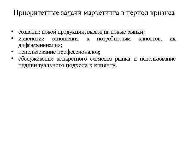 Приоритетные задачи маркетинга в период кризиса • создание новой продукции, выход на новые рынки; • изменение отношения к потребностям клиентов, их дифферен иация; ц • использование профессионалов; • обслуживание конкретного сегмента рынка и использование ин ивидуального подхода к клиенту. д