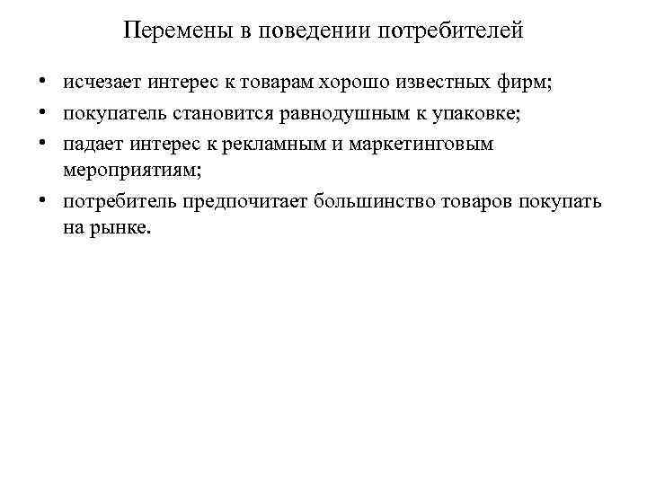 Перемены в поведении потребителей • исчезает интерес к товарам хорошо известных фирм; • покупатель становится равнодушным к упаковке; • падает интерес к рекламным и маркетинговым мероприятиям; • потребитель предпочитает большинство товаров покупать на рынке.
