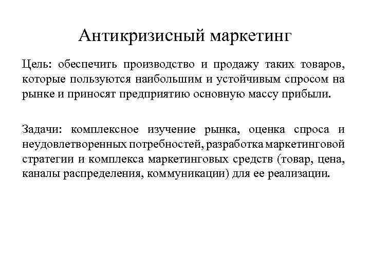 Антикризисный маркетинг Цель: обеспечить производство и продажу таких товаров, которые пользуются наибольшим и устойчивым спросом на рынке и приносят предприятию основную массу прибыли. Задачи: комплексное изучение рынка, оценка спроса и неудовлетворенных потребностей, разработка маркетинговой стратегии и комплекса маркетинговых средств (товар, цена, каналы распределения, коммуникации) для ее реализации.