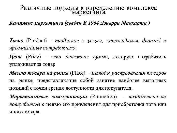 Различные подходы к определению комплекса маркетинга Комплекс маркетинга (введен В 1964 Джерри Маккарти ) Товар (Product)–– продукция и услуги, производимые фирмой и предлагаемые потребителю. Цена (Price) – это денежная сумма, которую потребитель уплачивает за товар Место товара на рынке (Place) –методы распределения товаров на рынке, представляющие собой занятие наиболее выгодных позиций с точки зрения доступности для покупателя. Маркетинговые коммуникации (Promotion) – воздействие на потребителя с целью его привлечения для приобретения того или иного товара.