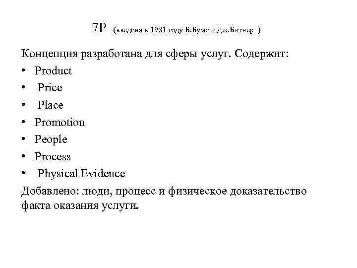 7 P (введена в 1981 году Б. Бумс и Дж. Битнер ) Концепция разработана для сферы услуг. Содержит: • Product • Price • Place • Promotion • People • Process • Physical Evidence Добавлено: люди, процесс и физическое доказательство факта оказания услуги.
