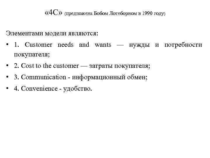 « 4 С» (предложена Бобом Лотеборном в 1990 году) Элементами модели являются: • 1. Customer needs and wants — нужды и потребности покупателя; • 2. Cost to the customer — затраты покупателя; • 3. Communication информационный обмен; • 4. Convenience удобство.
