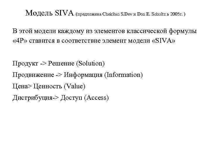 Модель SIVA (предложена Chekitan S. Dev и Don E. Schultz в 2005 г. ) В этой модели каждому из элементов классической формулы « 4 Р» ставится в соответствие элемент модели «SIVA» Продукт > Решение (Solution) Продвижение > Информация (Information) Цена> Ценность (Value) Дистрибуция > Доступ (Access)