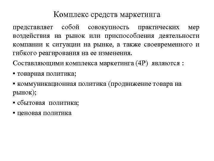 Комплекс средств маркетинга представляет собой совокупность практических мер воздействия на рынок или приспособления деятельности компании к ситуации на рынке, а также своевременного и гибкого реагирования на ее изменения. Составляющими комплекса маркетинга (4 Р) являются : • товарная политика; • коммуникационная политика (продвижение товара на рынок); • сбытовая политика; • ценовая политика
