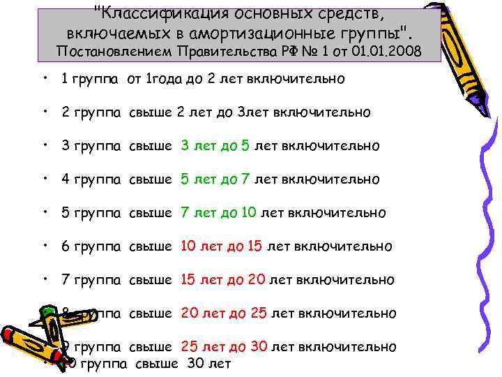 "Классификация основных средств, включаемых в амортизационные группы". Постановлением Правительства РФ № 1 от 01. 2008 • 1 группа от 1 года до 2 лет включительно • 2 группа свыше 2 лет до 3 лет включительно • 3 группа свыше 3 лет до 5 лет включительно • 4 группа свыше 5 лет до 7 лет включительно • 5 группа свыше 7 лет до 10 лет включительно • 6 группа свыше 10 лет до 15 лет включительно • 7 группа свыше 15 лет до 20 лет включительно • 8 группа свыше 20 лет до 25 лет включительно • 9 группа свыше 25 лет до 30 лет включительно • 10 группа свыше 30 лет