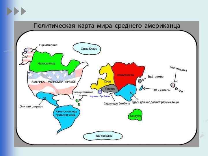 Политическая карта мира— тематическая карта, на которой определенными выделениями показаны границы всех стран мира, государственные границы всех стран мира. • В наше время насчитывается около 230 стран, которые различаются: • -географическим положением; • -величиной территории; • -численностью и национальным составом населения; • -форме правления; • -государственному устройству; • -уровню социально–экономического развития.